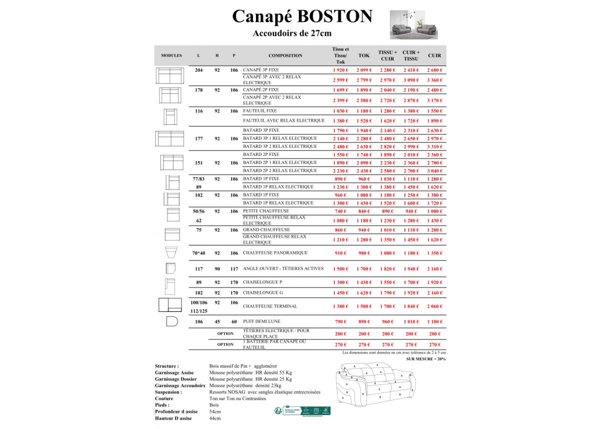 Cette collection BOSTON est également modulable ce qui veut dire que vous pouvez le créer en fonction de la configuration et la dimension que vous souhaitez (canapé d'angle, canapé 4, 5, 6 places ou plus) pour cela merci de nous contacter.