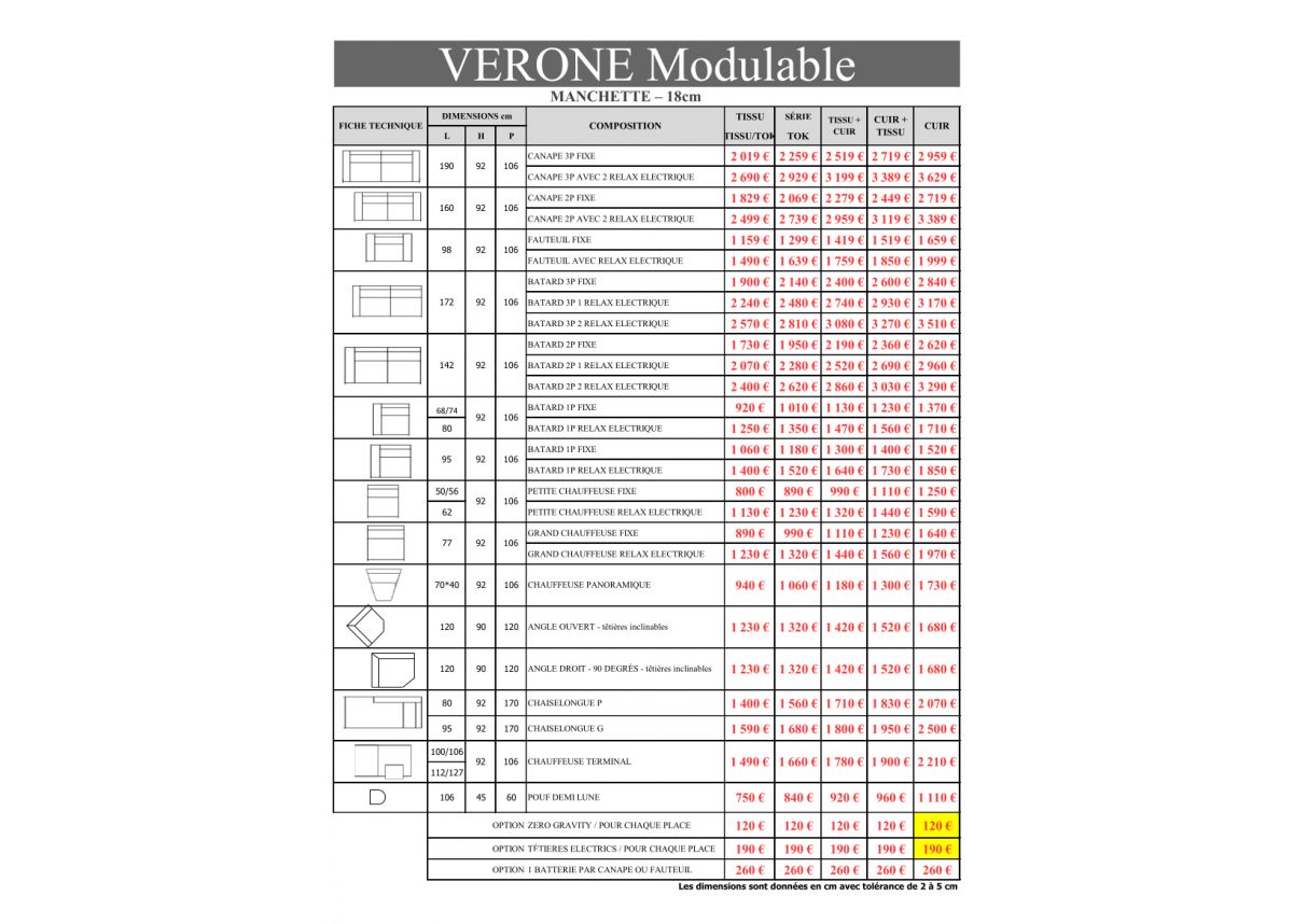 Cette collection VERONA est modulable ce qui veut dire que vous pouvez le créer en fonction de la configuration et la dimension que vous souhaitez (canapé d'angle, canapé 4, 5, 6 places ou plus) pour cela merci de nous contacter.